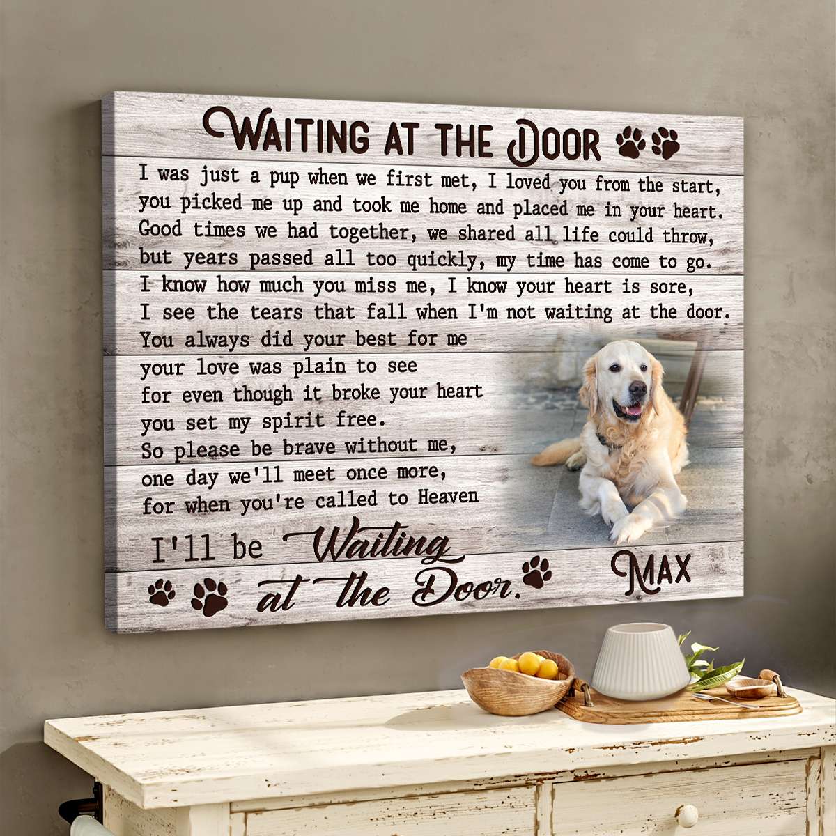 It’s your Waiting At The Door custom canvas print, featuring a heartwarming photo of your pet alongside a touching poem.