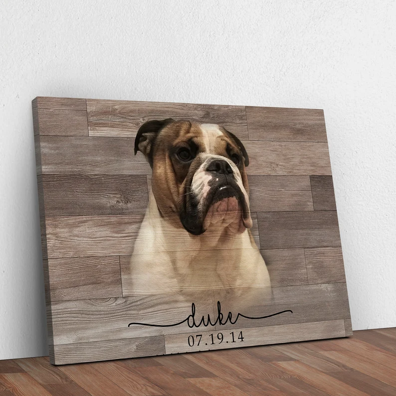 "Let the memory of your beloved family member live on with this custom dog memorial pet loss frame portrait. Take comfort in the elegant wood patterns that are sure to complement any photo canvas for any home décor style.